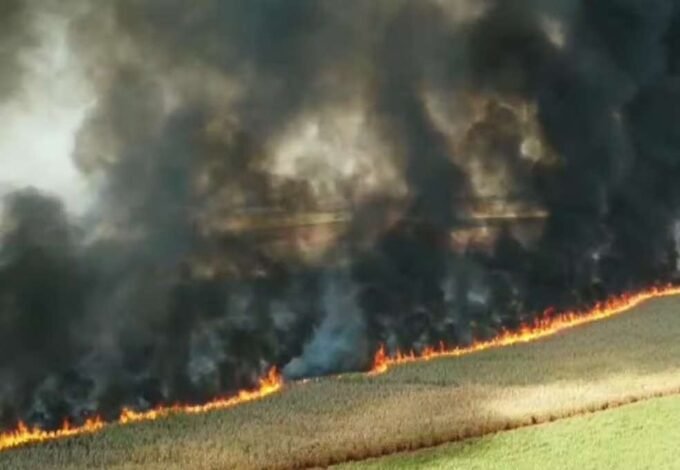 Fogo avançou com a ajuda do vento e do tempo seco, destruindo uma área com cana-de-açúcar já próxima da colheita, e em outro...