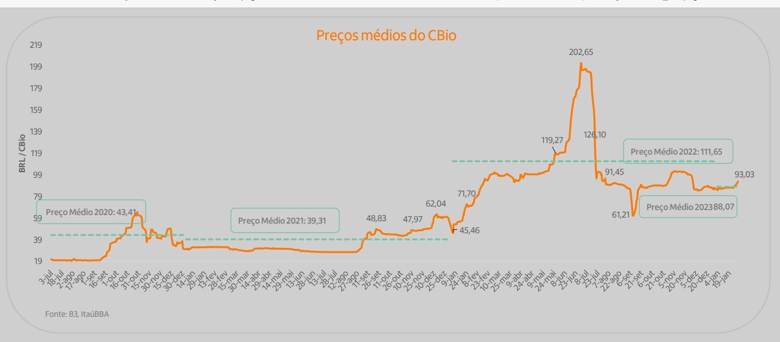 Os preços médios das negociações dos Cbios fecharam a 2ª quinzena de janeiro em R$ 93,03/Cbio, valor 5,6% acima da média de preço de 2023 que estava em R$ 88,07/Cbio, segundo o último levantamento do Itaú BBA.