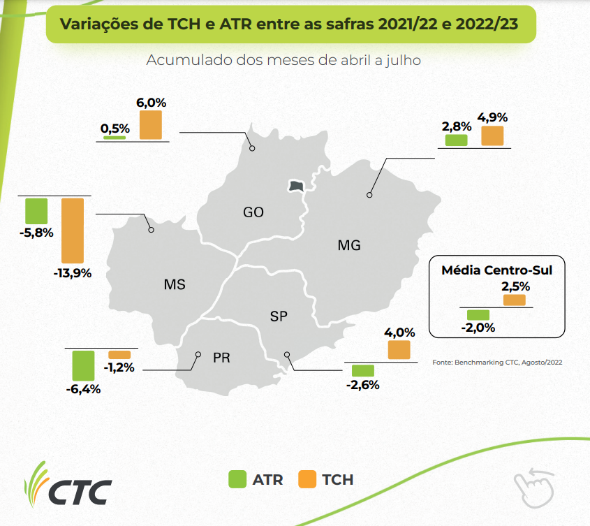 No acumulado de safra de cana-de-açúcar do Centro-Sul de abril de 2021 até julho de 2022, o ATR médio caiu 2% enquanto o TCH médio da região subiu 2,5%. Os dados são do último boletim divulgado pelo CTC (Centro de Tecnologia Canavieira) em agosto de 2022.