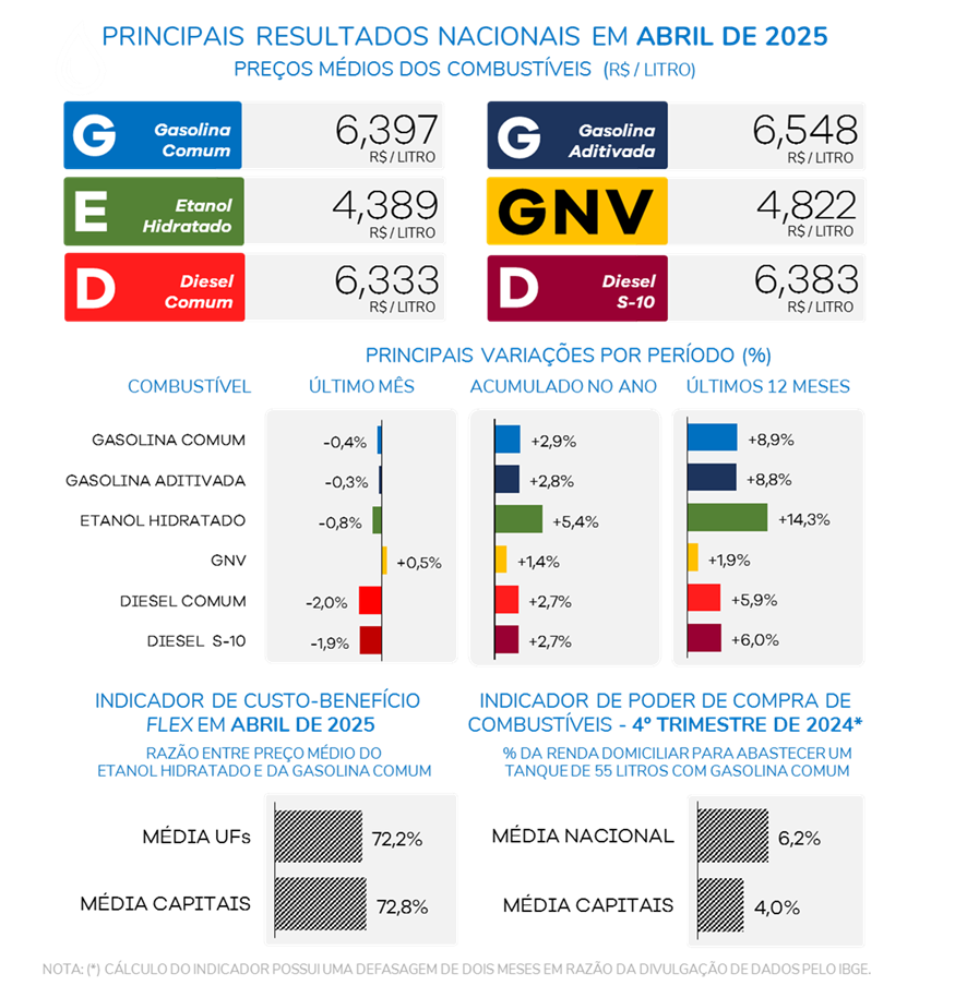 De acordo com o Indicador de Custo-Benefício Flex, em abril de 2025, o preço médio do etanol correspondeu a 72,2% do valor da gasolina comum no cenário nacional e 72,8% na média das capitais, o que, considerando o rendimento dos combustíveis, favoreceu a escolha pela gasolina em diversas regiões.