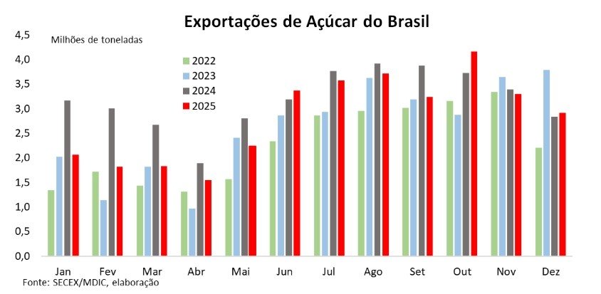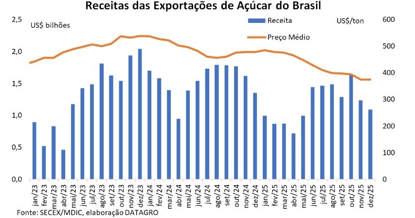 Em função dos menores preços do açúcar no mercado internacional e da variação cambial, o valor médio do açúcar exportado pelo Brasil em dezembro foi de US$ 374,55/tonelada, queda de 21,6% em relação a dezembro de 2024 e o menor nível desde novembro de 2021. Como resultado, a receita total com exportações de açúcar recuou 19,4% na comparação anual, somando US$ 1,091 bilhão no mês. No acumulado de 2025, a receita atingiu US$ 14,109 bilhões, retração de 24,2% frente ao ano anterior.