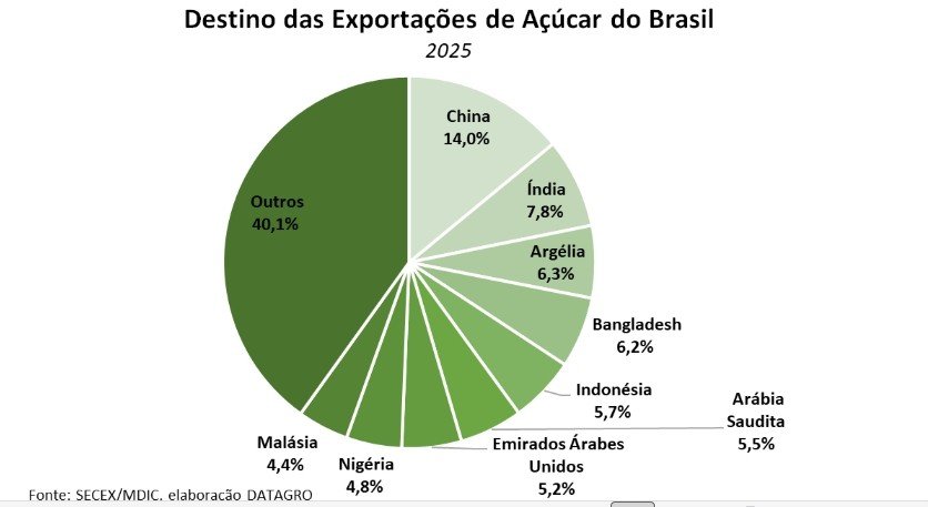 Apesar da retração na comparação anual, o desempenho das exportações reforça a posição do Brasil como principal exportador global da commodity, sustentado pela competitividade do açúcar brasileiro no mercado internacional e pela demanda ainda firme da China e de Bangladesh ao longo do ano.