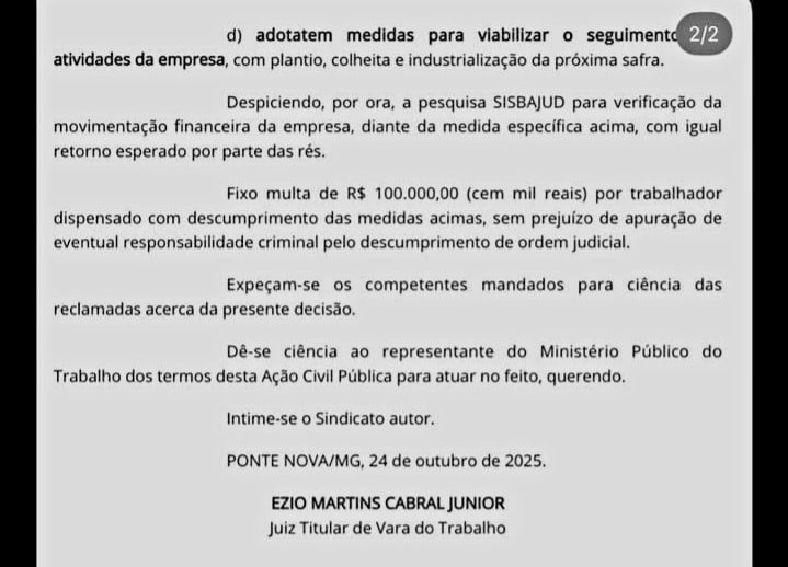 A Justiça do Trabalho determinou a suspensão imediata das demissões em massa na Usina Jatiboca, localizada em Urucânia, na Zona da Mata mineira. A decisão, proferida pelo juiz Ezio Martins Cabral Junior, titular da Vara do Trabalho de Ponte Nova, foi tomada no âmbito de uma Ação Civil Pública movida pelo sindicato da categoria, após denúncias de dispensas coletivas e risco de paralisação das atividades.