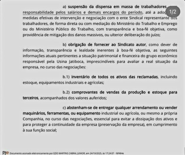 A usina também foi obrigada a fornecer ao sindicato informações sobre sua situação patrimonial e financeira, incluindo inventário de ativos e comprovantes de vendas de produção e estoques. O juiz proibiu a venda, arrendamento ou entrega de máquinas e equipamentos agrícolas e industriais, medida voltada a preservar a capacidade produtiva. Além disso, determinou a adoção de providências para viabilizar o plantio, a colheita e a industrialização da próxima safra.