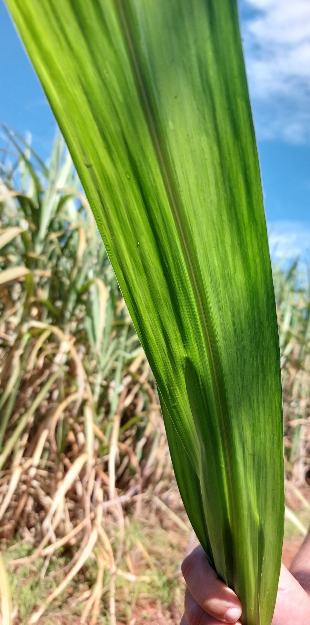 Os sintomas do mosaico podem ser confundidos com deficiência de cobre, trips, herbicida e até mancha genética. Nas fotos anexadas é 100% sintomas de mosaico e pode ser observado manchas amareladas alongadas, causando perda de clorofila que é mais evidente nas folhas novas. Plantas jovens e de rápido crescimento são mais suscetíveis que plantas maduras, com crescimento mais lento. Na prática quando os sintomas ocorrerem em plantas adultas com alta intensidade, o risco é maior. Outro grande risco é o aumento da incidência e manutenção da fonte de inóculo.
