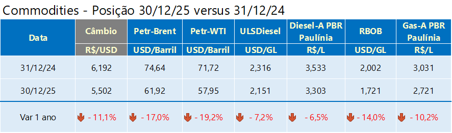 De 31/12/24 para 30/12/25, os preços despencaram: Brent caiu 17,0%, WTI caiu 19,2%, HO caiu 7,2% e Rbob caiu 14,0%.