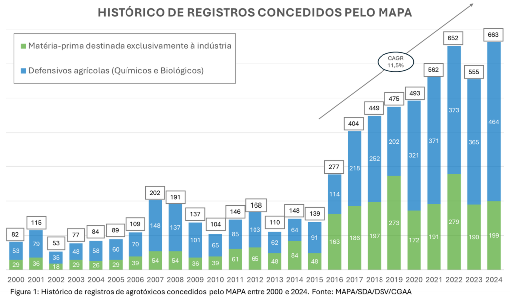 De acordo com a FAO, entre 1990 e 2022, o uso de pesticidas por área de cultivo aumentou 94% no mundo. A tendência de crescimento do número de registros no Brasil se justifica pela grande atratividade do mercado para a indústria de proteção de cultivos. O Brasil é o 4º maior país em volume de produção agrícola, sendo líder ou vice-líder na exportação das principais commodities agrícolas do mundo (soja, milho, algodão, carne bovina e de frango, suco de laranja, café, açúcar e etanol). As exportações do agronegócio alcançaram US$ 164,4 bilhões, representando 49% do total exportado pelo país.