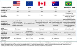 A tabela a seguir (Figura 3) apresenta uma comparação entre o Brasil e as agências internacionais mencionadas, destacando alguns critérios e o tempo médio entre a submissão e a conclusão da análise para o registro de uma nova molécula.