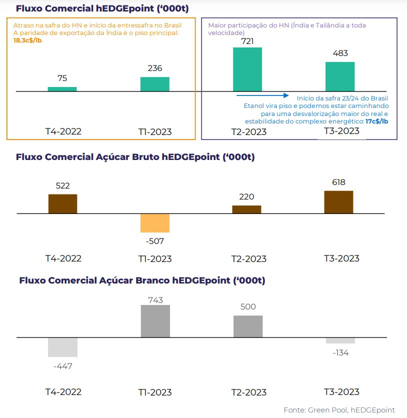 O aperto no fluxo comercial do bruto no primeiro trimestre é, portanto, resultado da entressafra brasileira combinada com uma quebra média entre qualidades de açúcar nas exportações indianas e tailandesas.