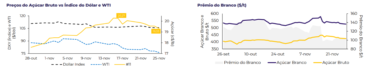Com os números positivos do Centro-Sul brasileiro e a moagem alcançando o patamar de 21/22, atingindo 516,7Mt no final da primeira quinzena de novembro, o mercado já apresentou correções ainda na semana passada. Esperamos que a moagem total atinja 546Mt em 22/23, já que os rendimentos estão melhores anualmente, e pelo menos 76 usinas ainda devem operar até o final de novembro — mais do que o triplo do ano passado.