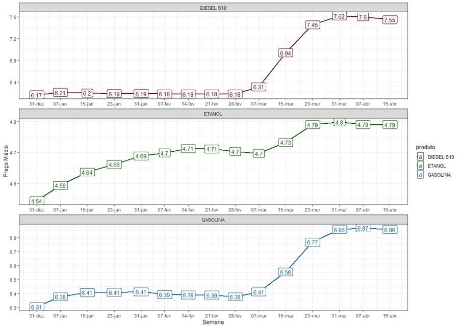Os resultados das últimas duas semanas, contudo, apontam para uma trégua na alta dos preços dos combustíveis – dialogando com anúncios de cessar-fogo e negociações em curto entre os países envolvidos no conflito internacional. O preço do diesel atingiu seu maior valor na última semana de março (R$ 7,62 por litro) e desde então, registrou discreto recuo na cotação nacional, para R$ 7,55. Os sinais de estabilização também foram observados nos demais combustíveis monitorados: o etanol hidratado atingiu seu maior preço nacional na última semana de março (R$ 4,80 por litro), enquanto o litro da gasolina comum marcou R$ 6,87 na média da primeira semana de abril.