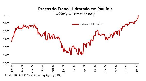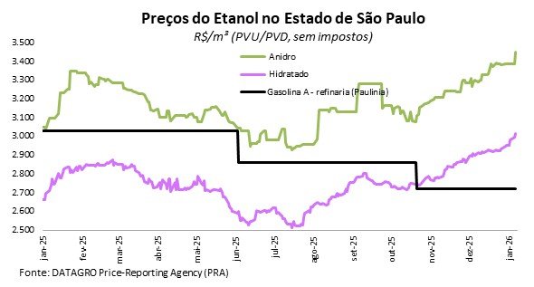 A perda de competitividade do etanol hidratado frente à gasolina nas bombas do estado de São Paulo, até o momento, não tem se refletido em enfraquecimento das negociações. As distribuidoras seguem ativas no mercado, recompondo estoques intermediários após o período de festas, enquanto as usinas se aproveitam do retorno da demanda para testar patamares gradualmente mais elevados de preços.