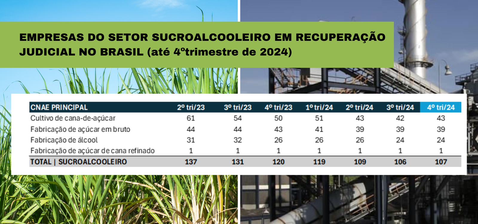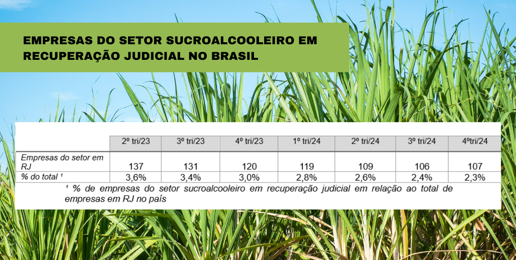 Ao final do 4º tri/2024, de acordo com Hugo Cayuela, sócio da consultoria RGF, 4,2% das empresas em atividade do setor estavam em RJ, enquanto a média geral, considerando todos os setores, foi de apenas 0,2%. “Dentre as 107 empresas em recuperação no setor ao final do 4º tri/2024, 40% tem como atividade principal o cultivo de cana-de-açúcar, enquanto 60% estão dedicadas à fabricação”, disse.