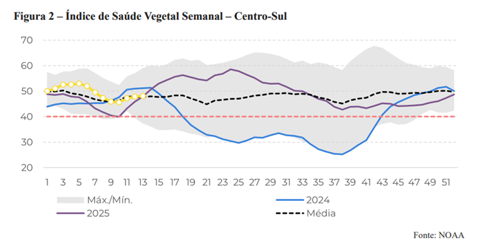 Nesse contexto, o etanol tem ganhado espaço no mix produtivo das usinas desde o final de 2025. Atualmente, o mercado opera com um mix próximo de 48% de açúcar, acima do nível estimado de equilíbrio, em torno de 44,5%, o que reforça o papel do biocombustível como principal alavanca de reequilíbrio entre oferta e demanda.