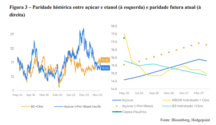 Como referência para esse ajuste, o piso do açúcar é estimado em torno de 13,5 centavos de dólar por libra-peso, considerando o etanol hidratado ao redor de R$ 2,2 por litro.