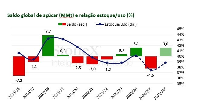 O mercado global de açúcar deve ter superávit na safra 2025/26, mas menor do que o que era aguardado. De acordo com o relatório da StoneX, empresa global de serviços financeiros, foi revisado o superávit em 2025/26 para 3,04 milhões de t, corte de cerca de 700 mil t frente ao estimado em maio.