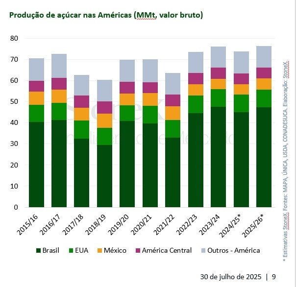 Na safra 2025/26, a produção no continente americano deve crescer 2,7%, puxada, em grande parte, pelo Brasil. Apesar dos problemas enfrentados no Centro-Sul brasileiro em 2025, especialmente motivada pela queda significativa de ATR e produtividade menor no comparativo anual, as estimativas preliminares para 2026 rondam o campo otimista, ao passo que se espera um canavial mais jovem – herdado principalmente das reformas pós-queimadas de 2024.