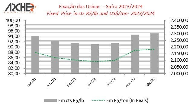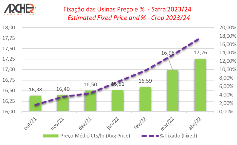 Até o final de abril de 2022, de acordo com a Archer, um total acumulado de 4.2 milhões de toneladas de açúcar estavam fixadas ao preço médio de 17.26 centavos de dólar por libra-peso sem prêmio de polarização, equivalentes a um percentual de fixação de 17.5% do volume estimado de exportação para a safra 23/24, como mostra o gráfico no topo da página.